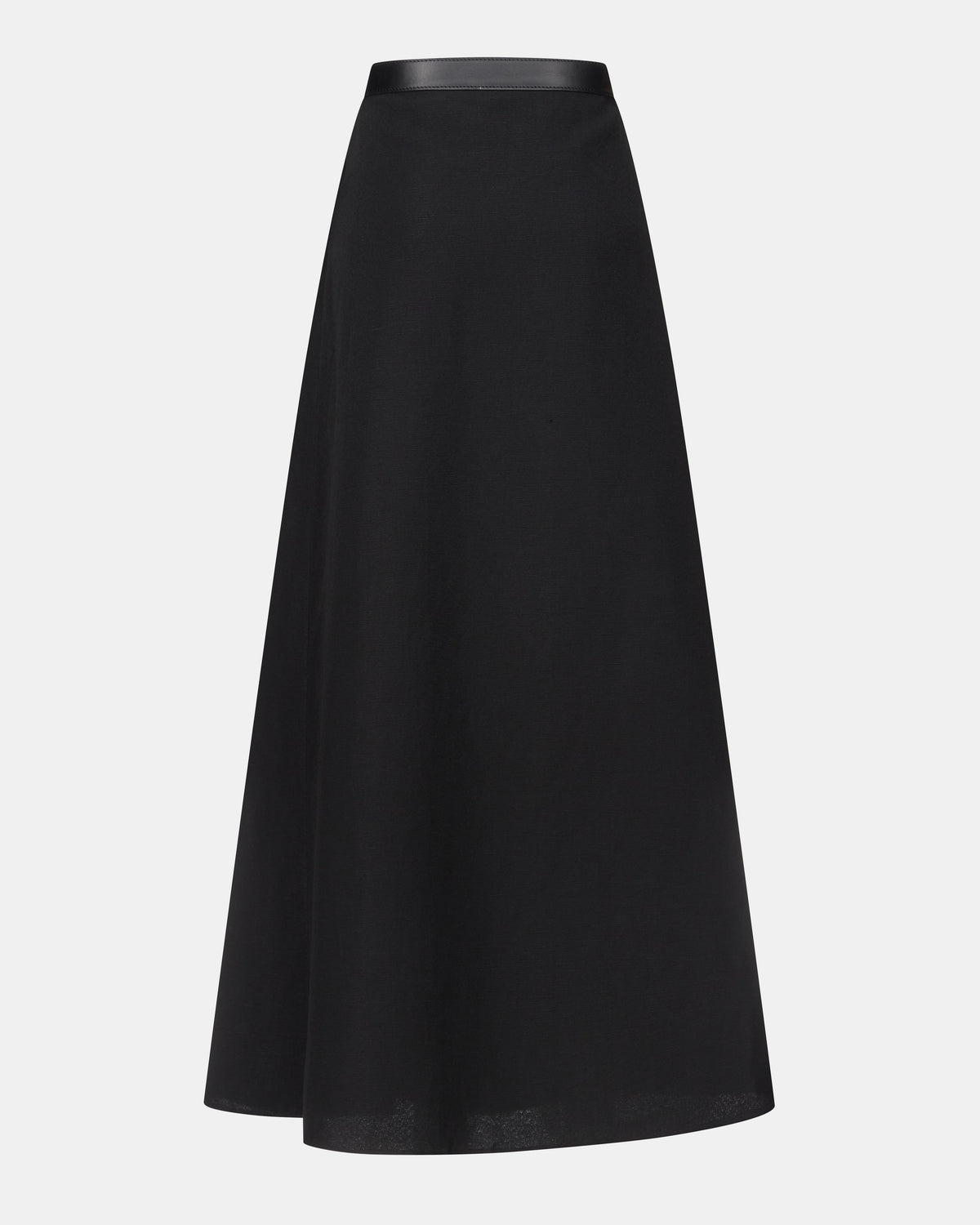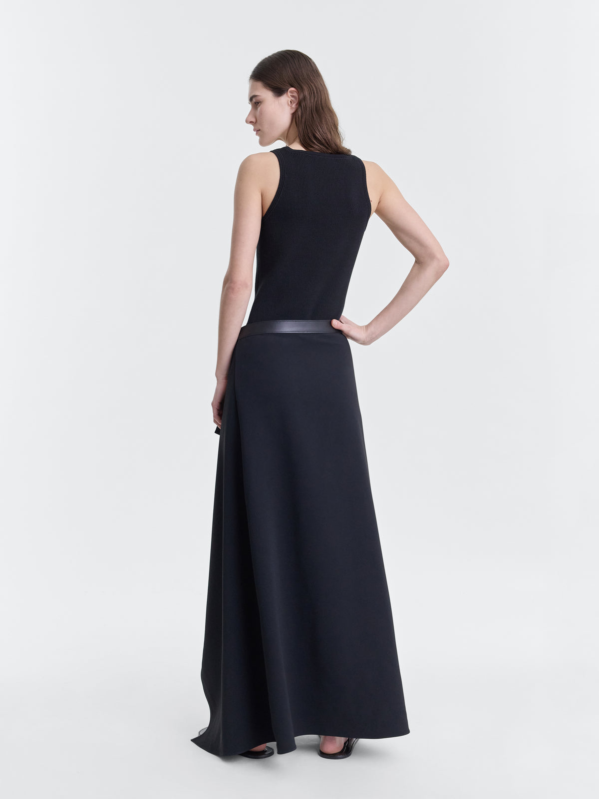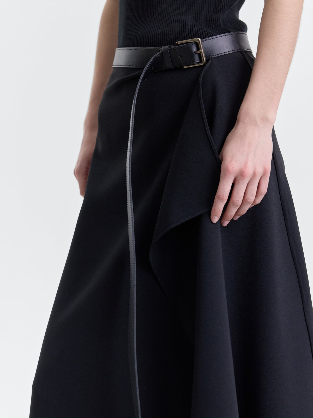 Asymmetric wrap skirt in black lightweight crepe with leather belt detail.