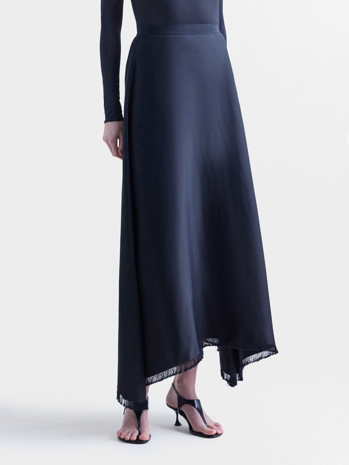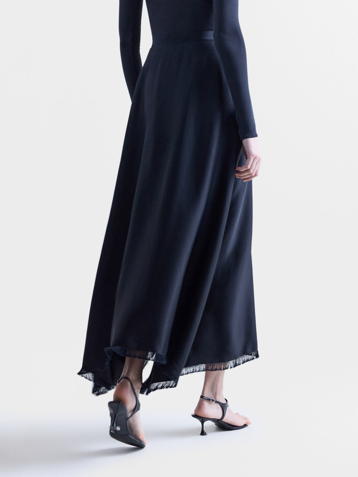 Fluid draped skirt with frayed hemline in black viscose twill.