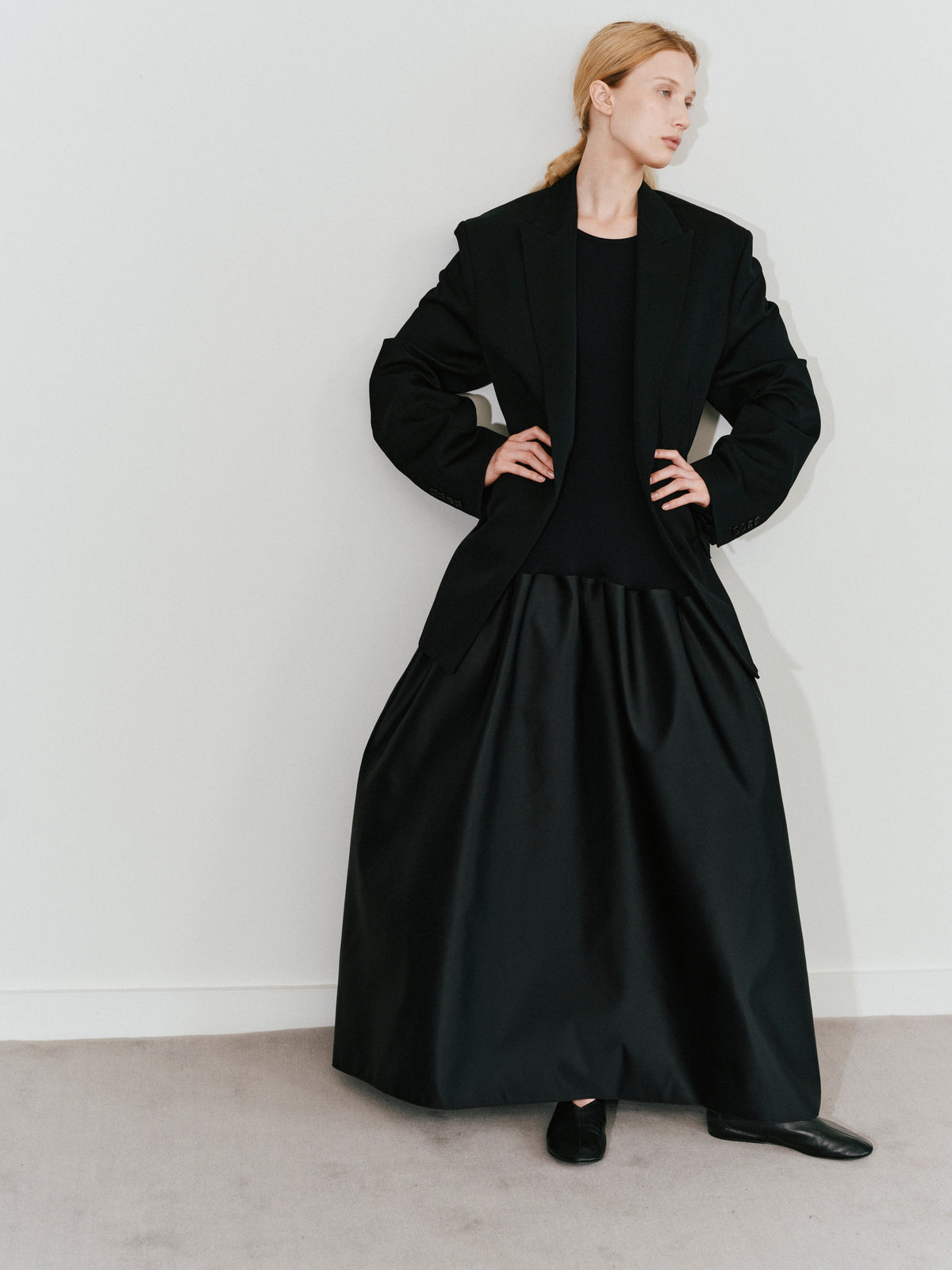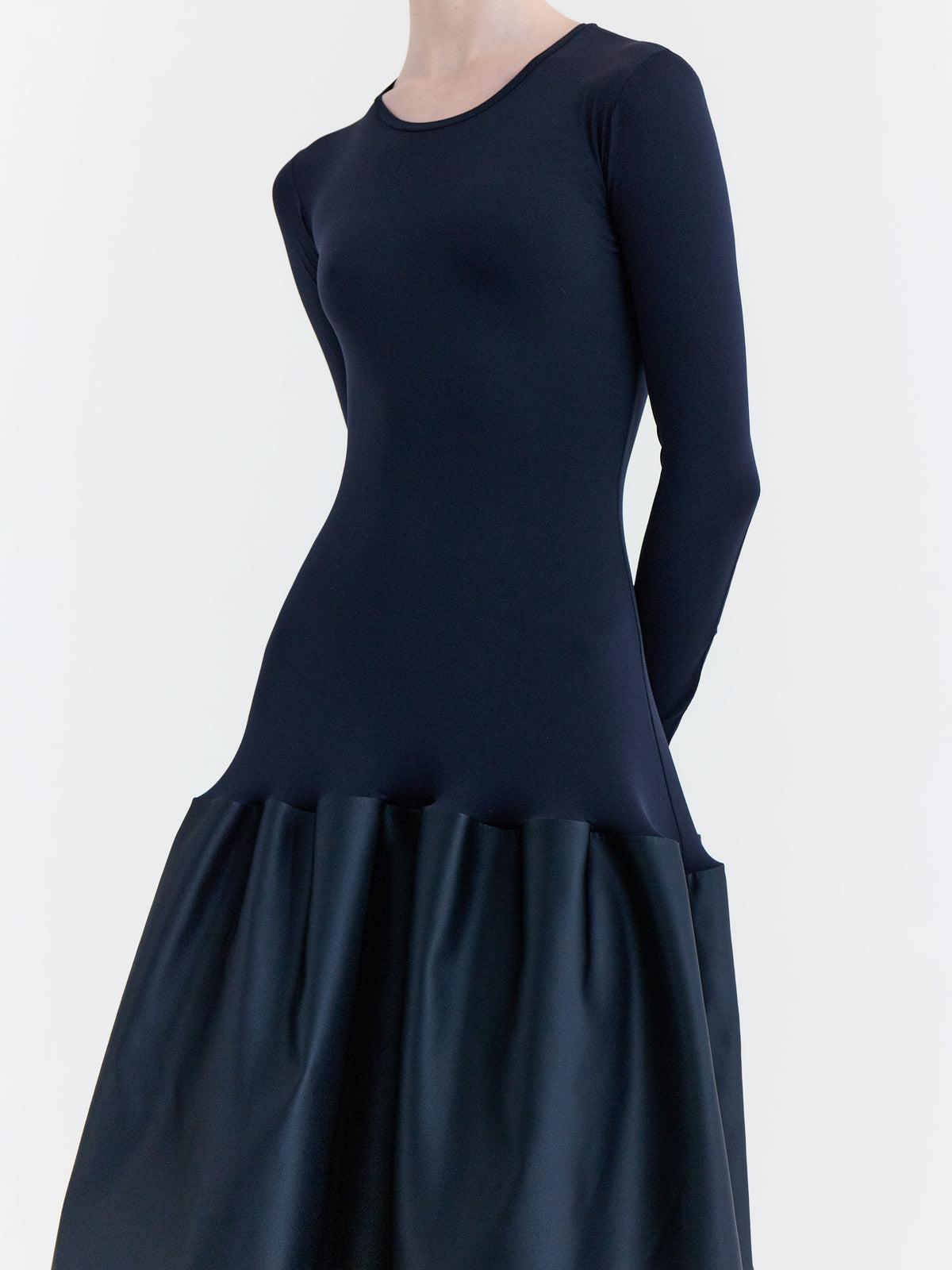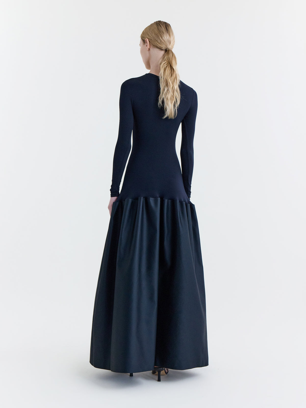 Fitted gown with drop waist detailing in black stretch jersey and with duchesse satin skirt.