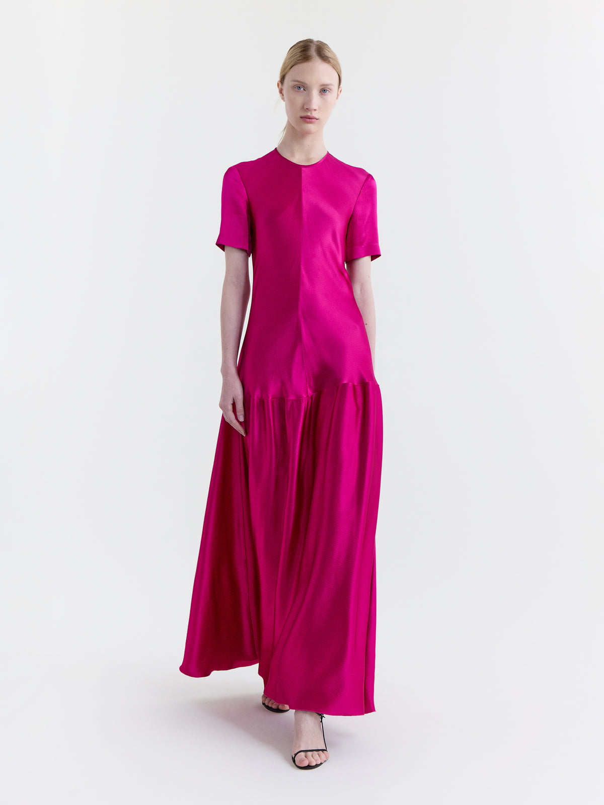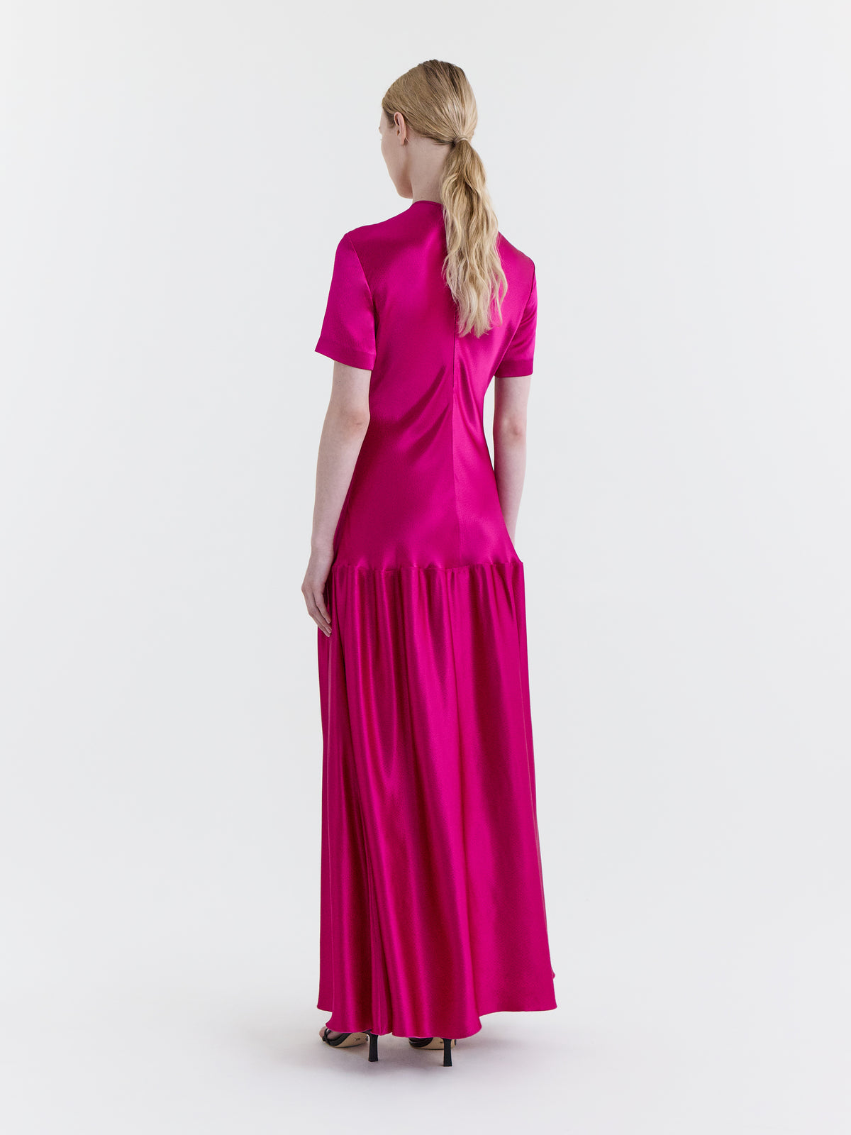 Short sleeve bias-cut dress with drop waist detail in fuchsia hammered satin.