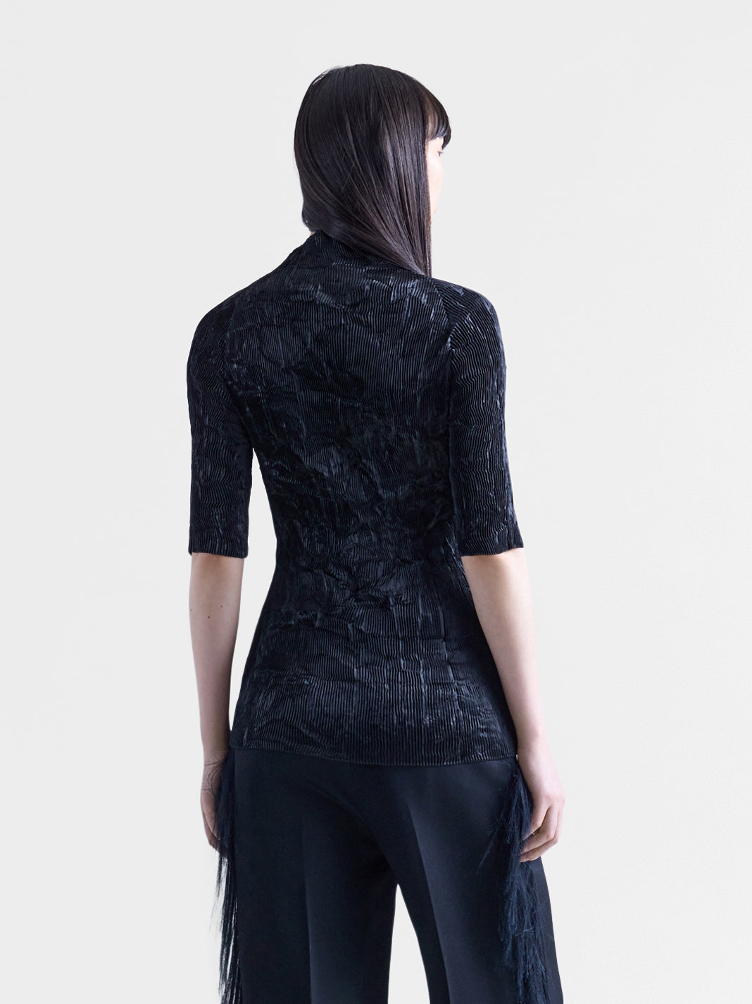 Garment pleated mock-neck top in black