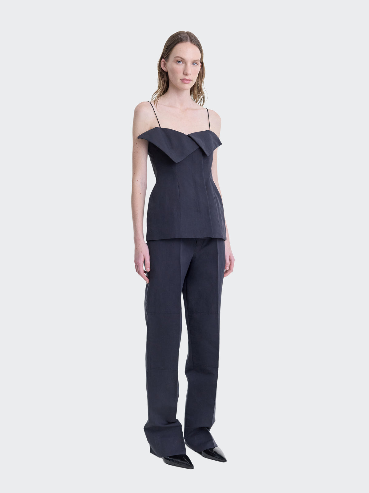 Tailored camisole top with folded neckline detail in black cotton silk faille.