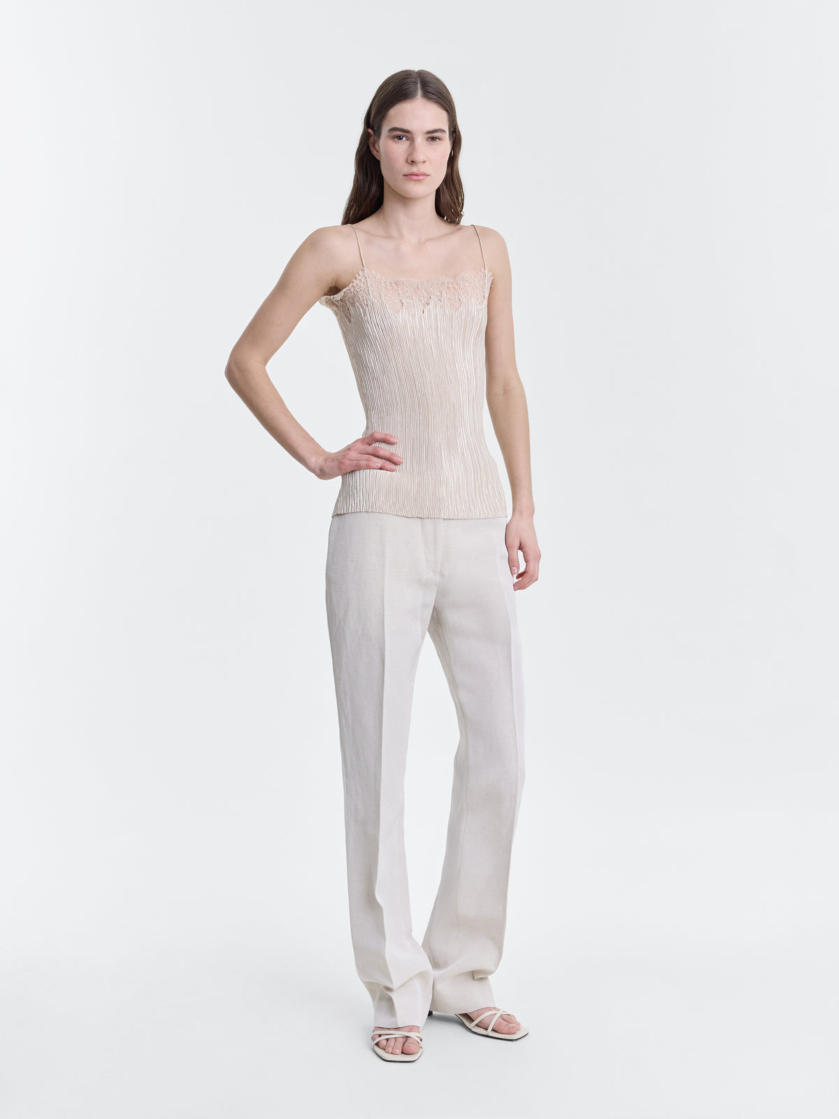 Pleated camisole with hand encrusted lace detailing in lightweight ivory satin.