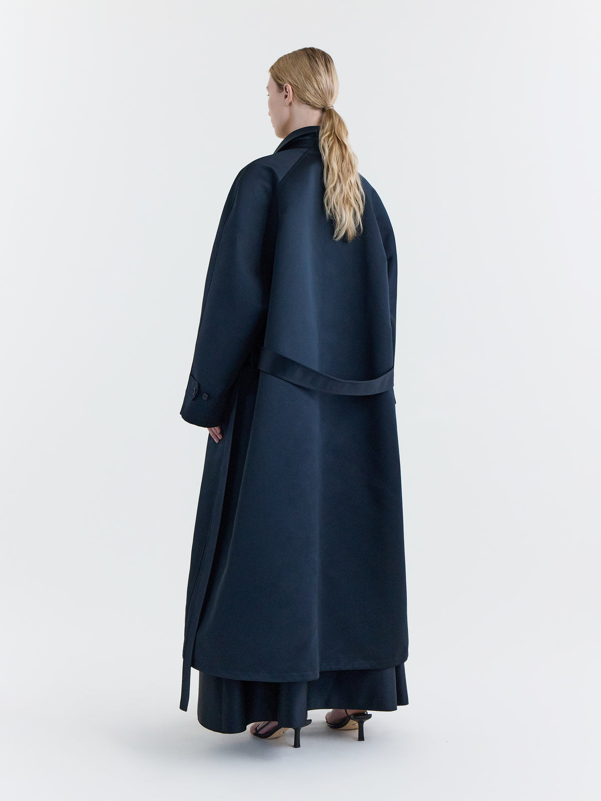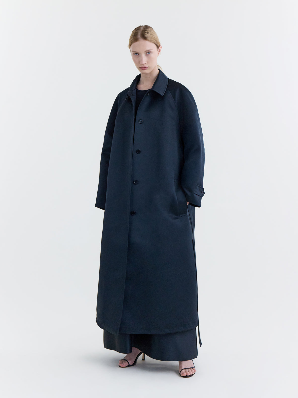 Relaxed car coat in black duchesse satin.