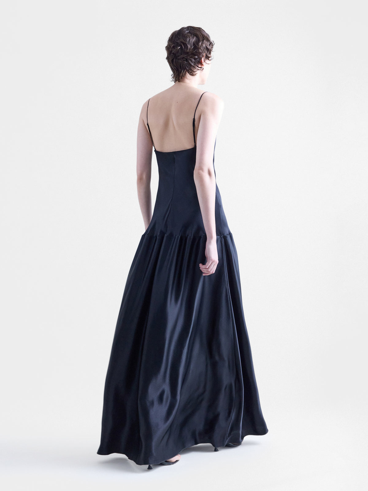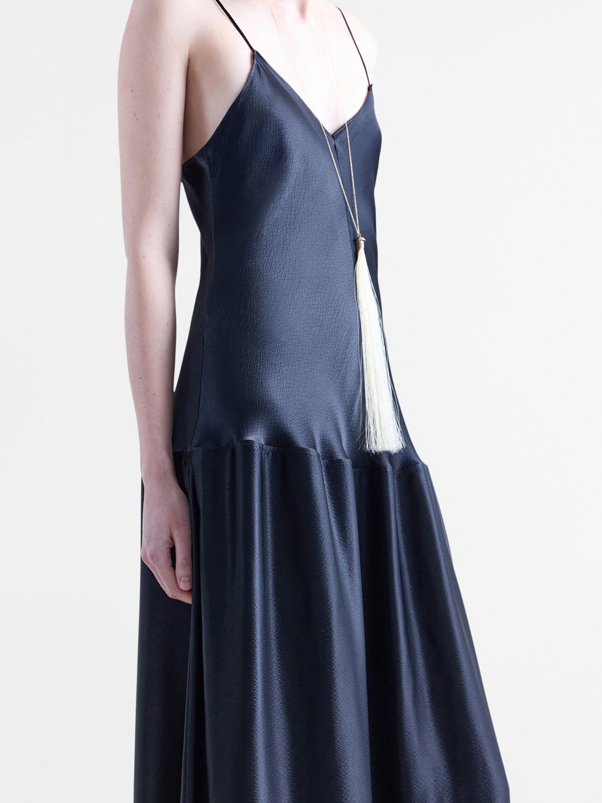 Bias-cut slip dress with curved drop-waist detail in black viscose hammered satin.