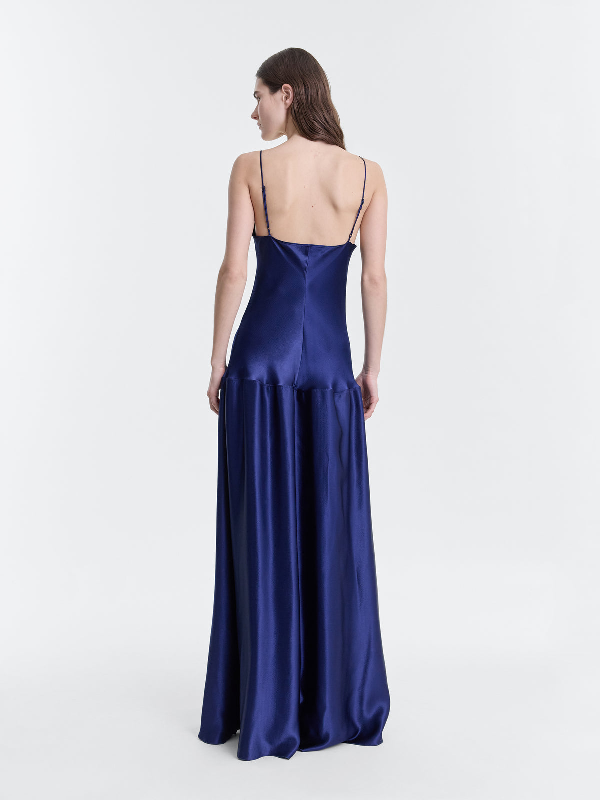 Bias cut tank dress in Prussian Blue liquid hammered satin.