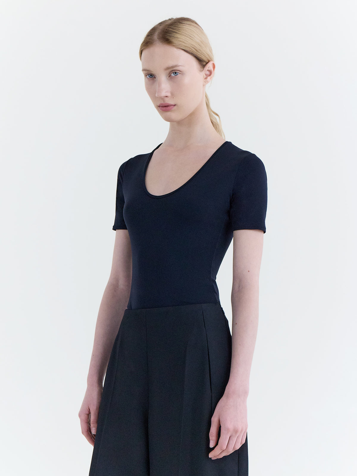 Short sleeve scoop neck t-shirt in lightweight stretch jersey.