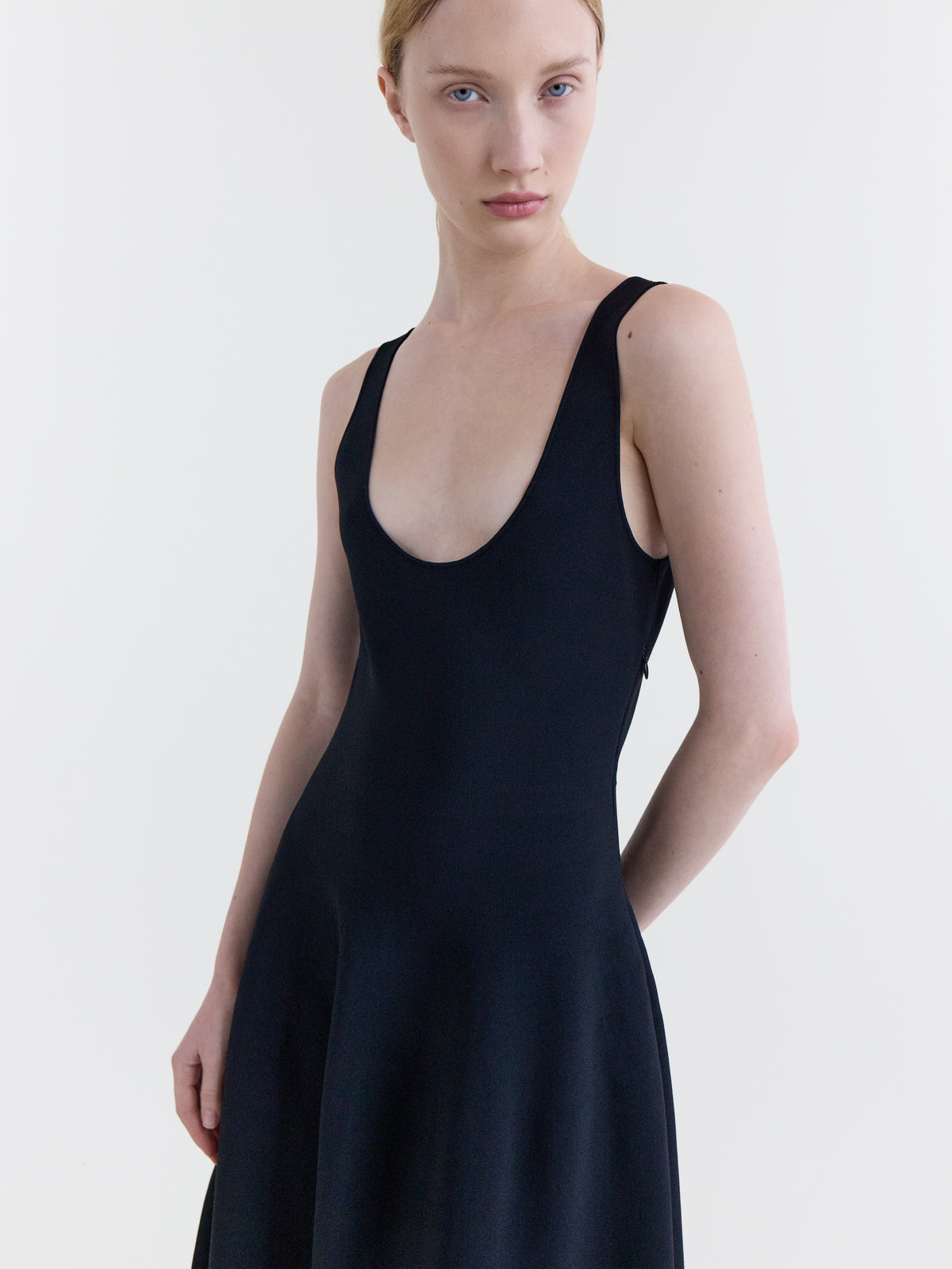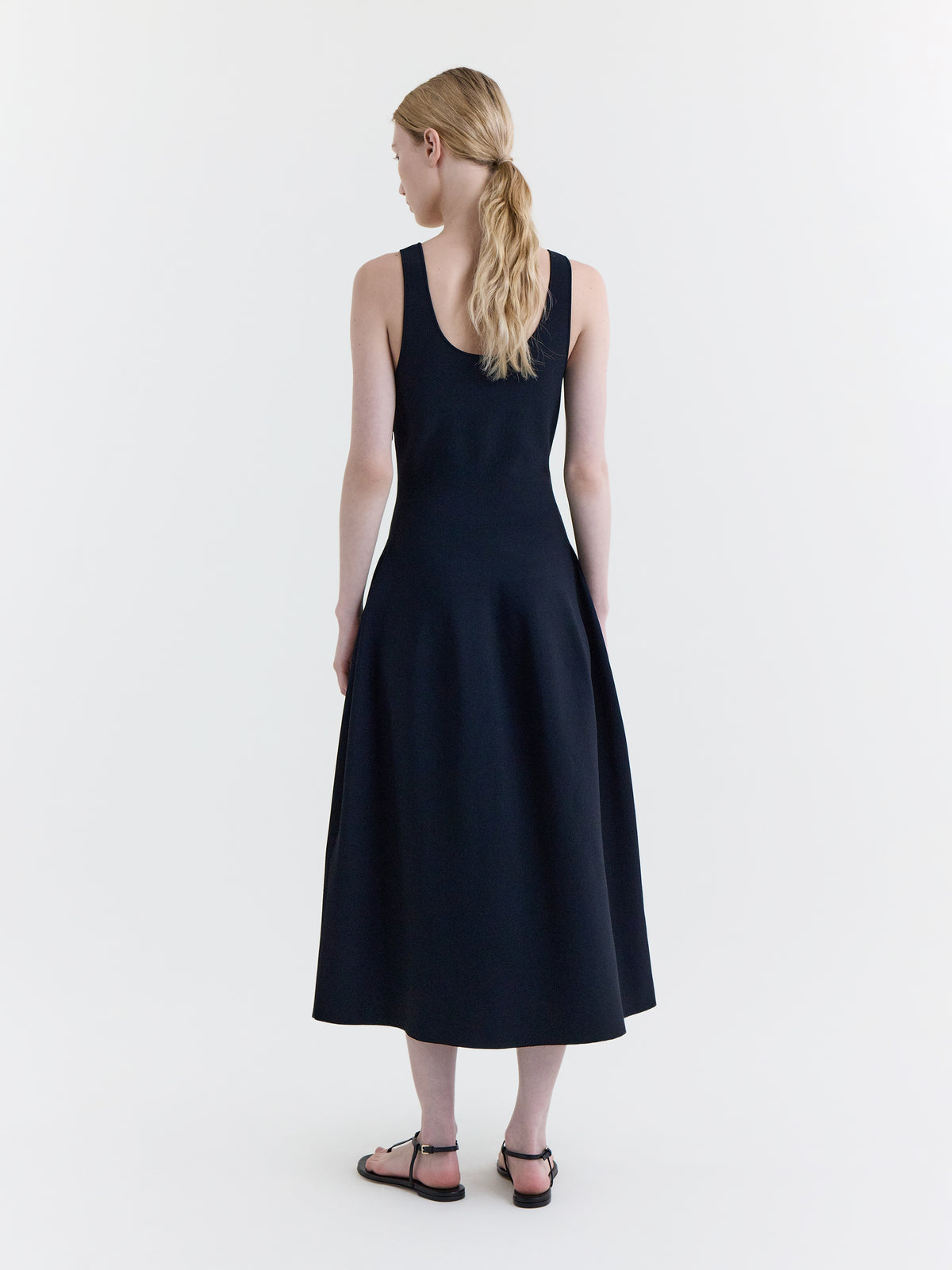 Scoop neck dress with soft structured skirt detail in black stretch viscose knit.