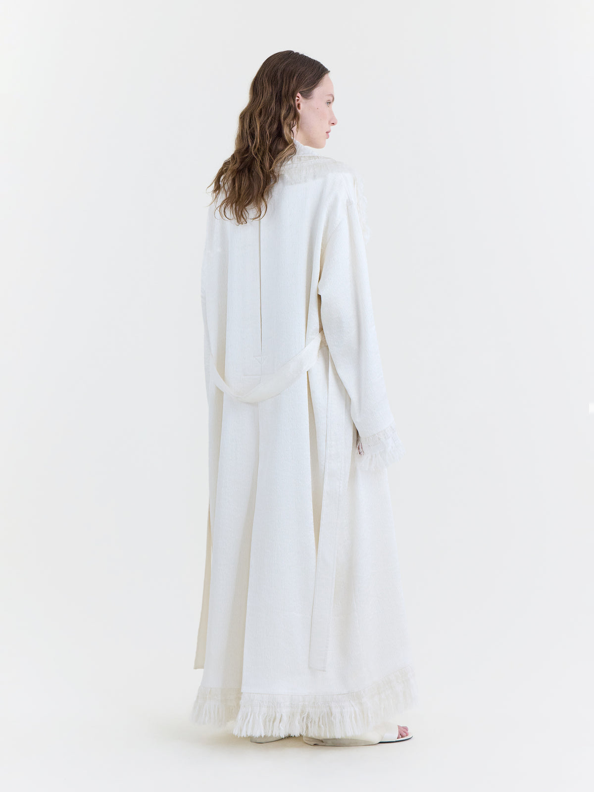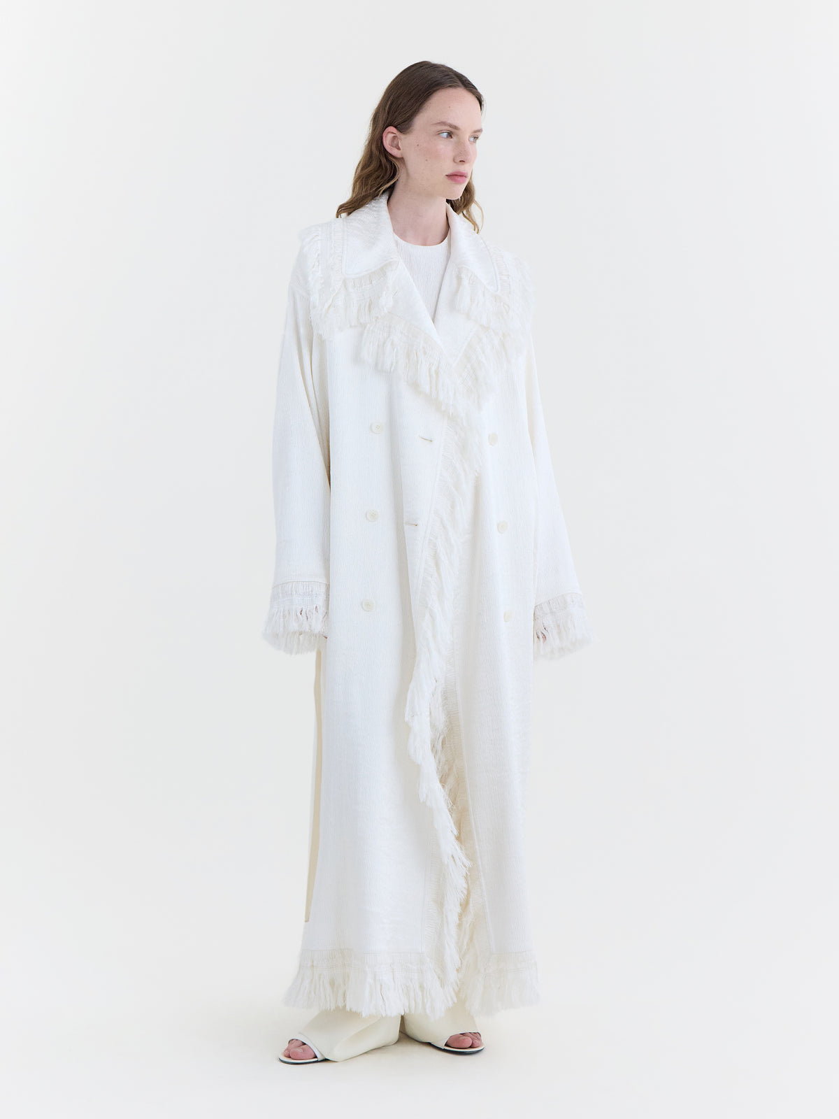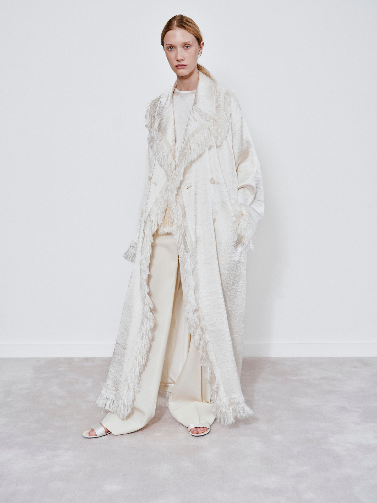 Double breasted trench coat with fringe detailing in cream woven silk ottoman.