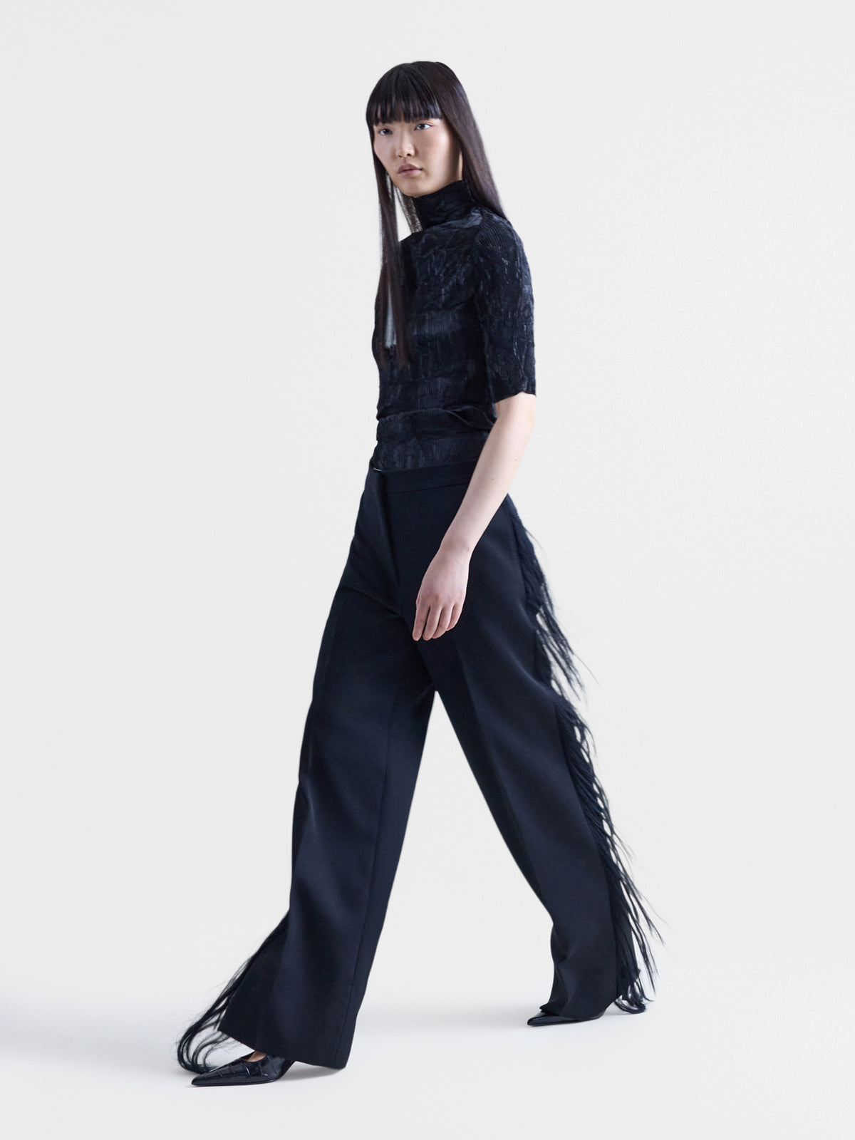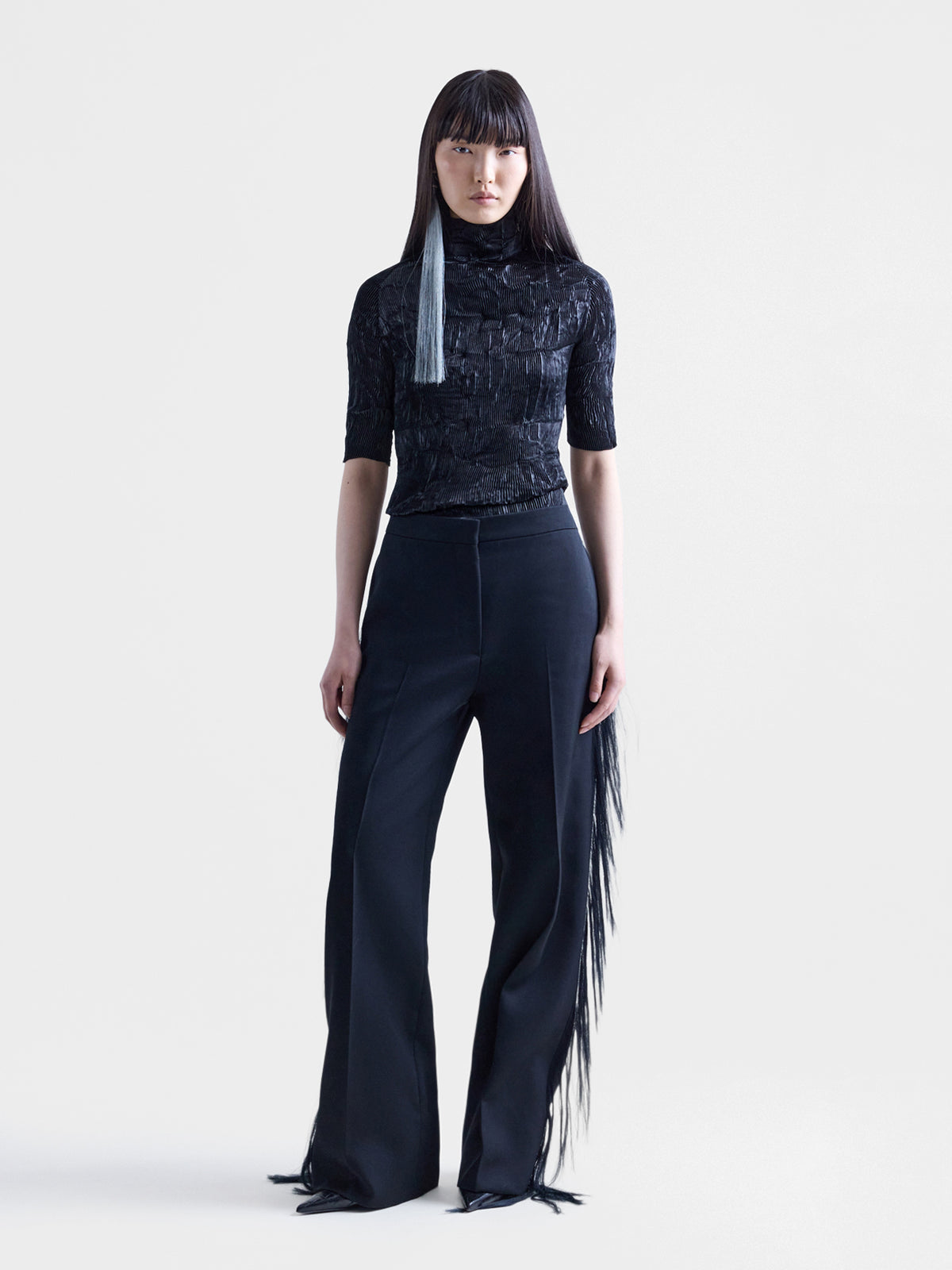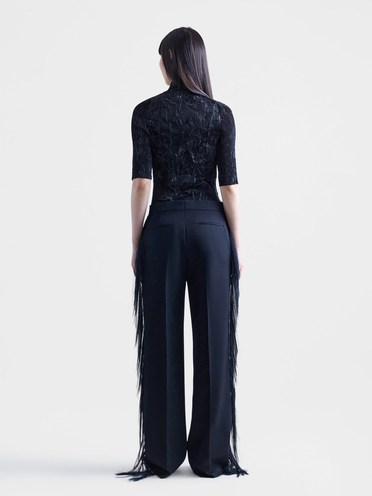 Handcrafted straight leg trouser with fringe detail in black sharp wool suiting.