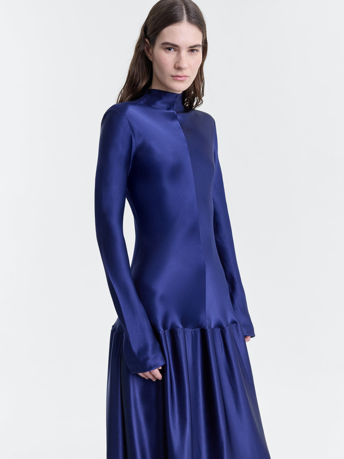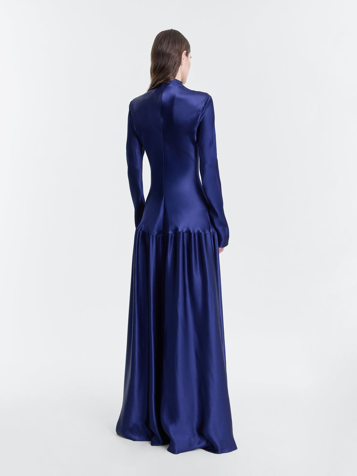 Bias cut gown in Prussian Blue liquid hammered satin.