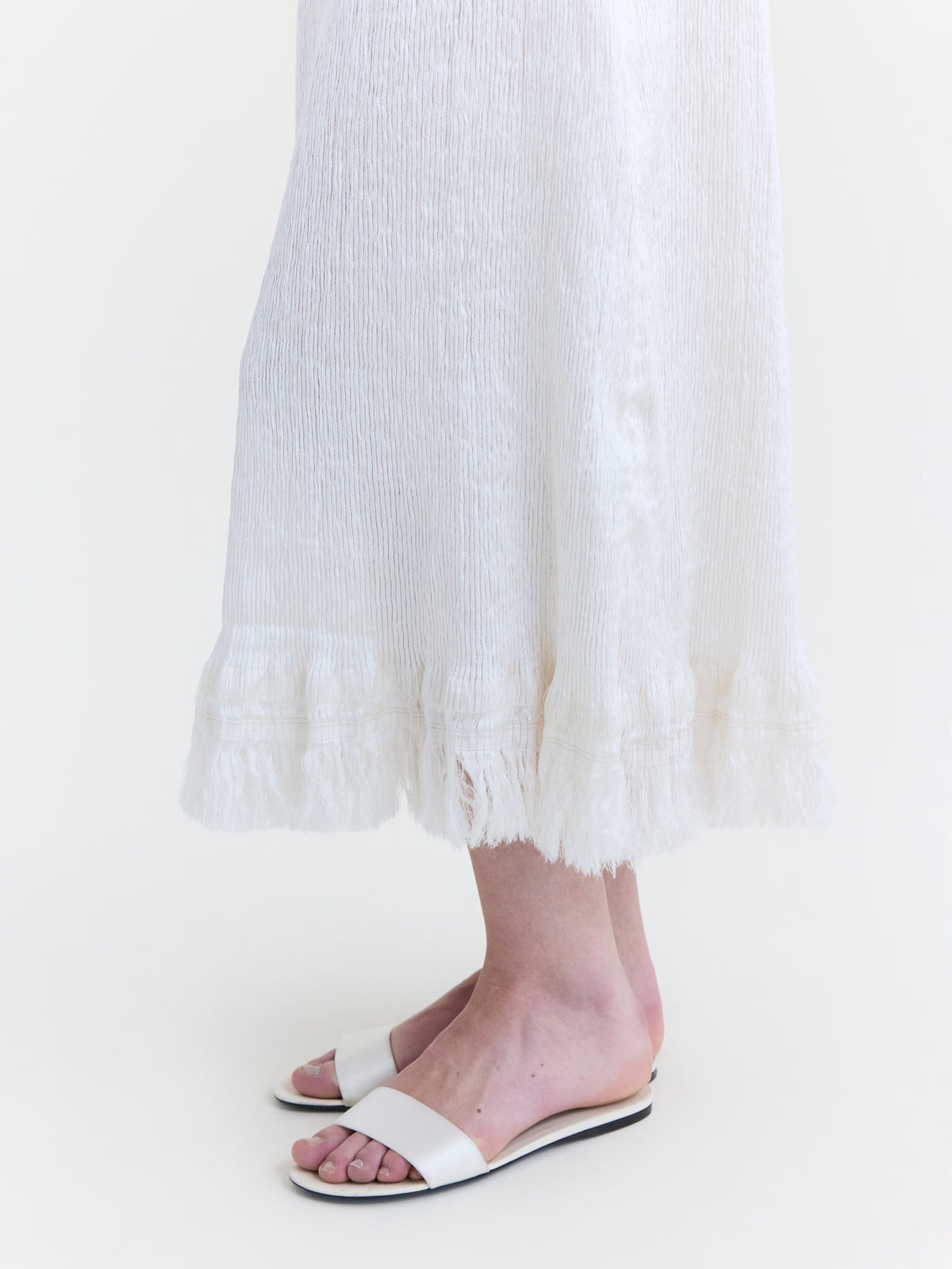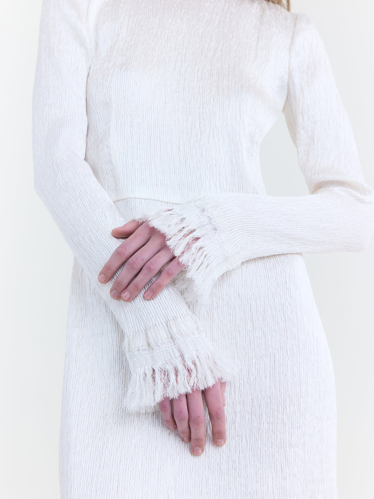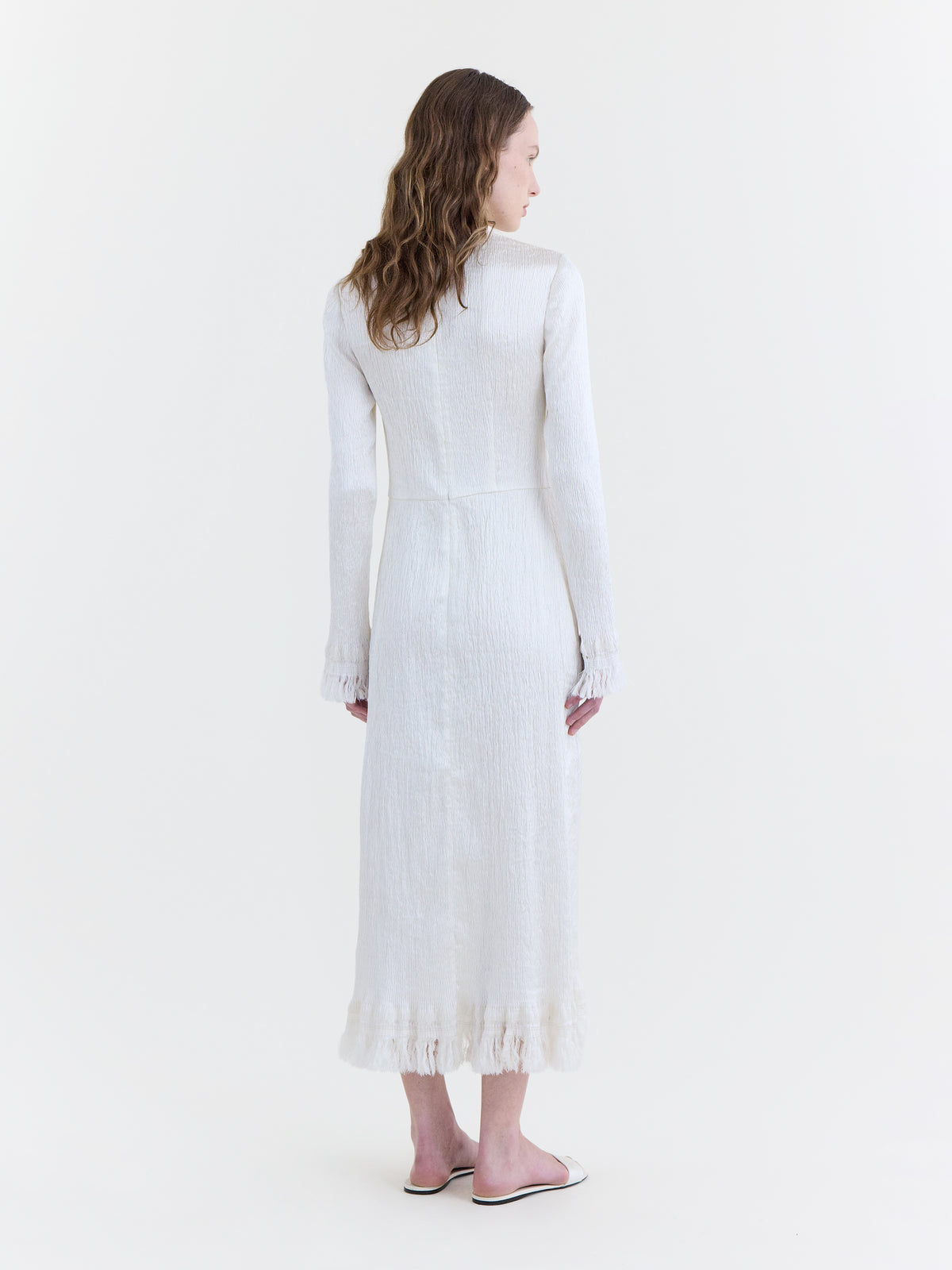 Long sleeve dress with fitted waist and frayed edge detailing in cream woven silk ottoman.