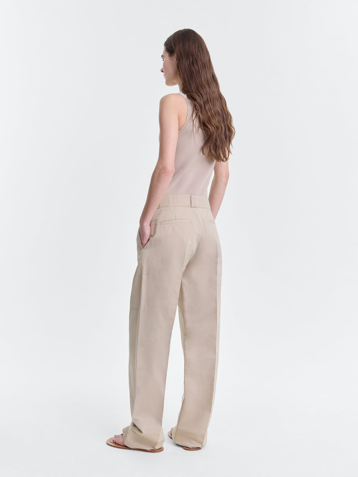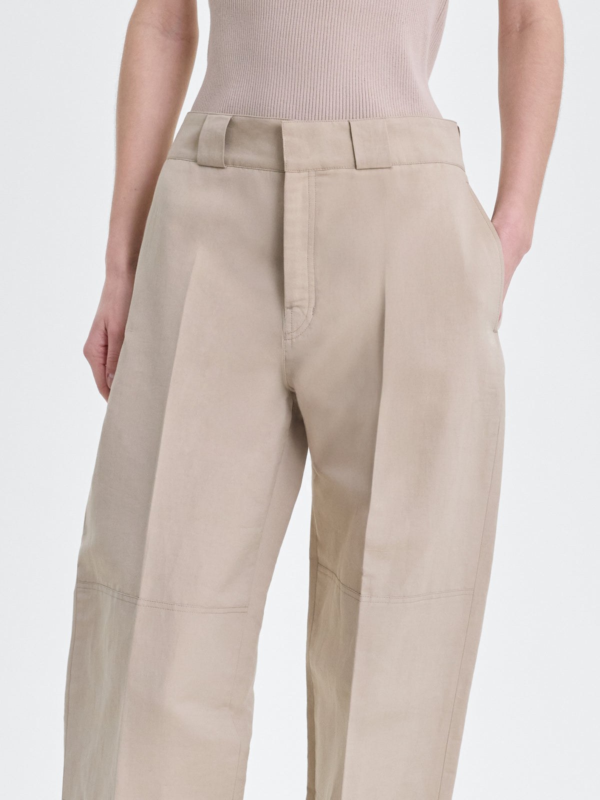Loose fit utility trouser in ecru lightweight cotton silk faille.