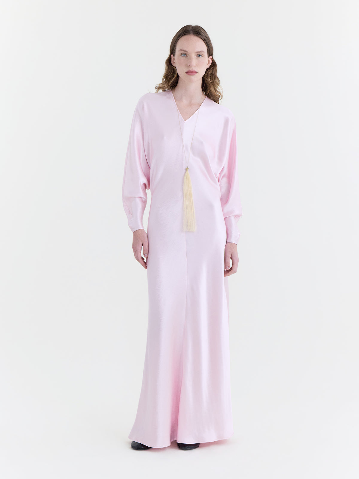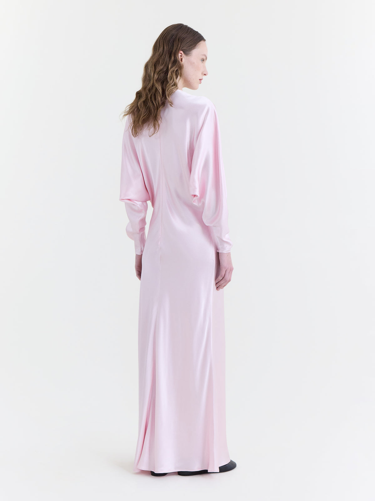 Long sleeve bias-cut dress with flared skirt in orchid hammered satin.