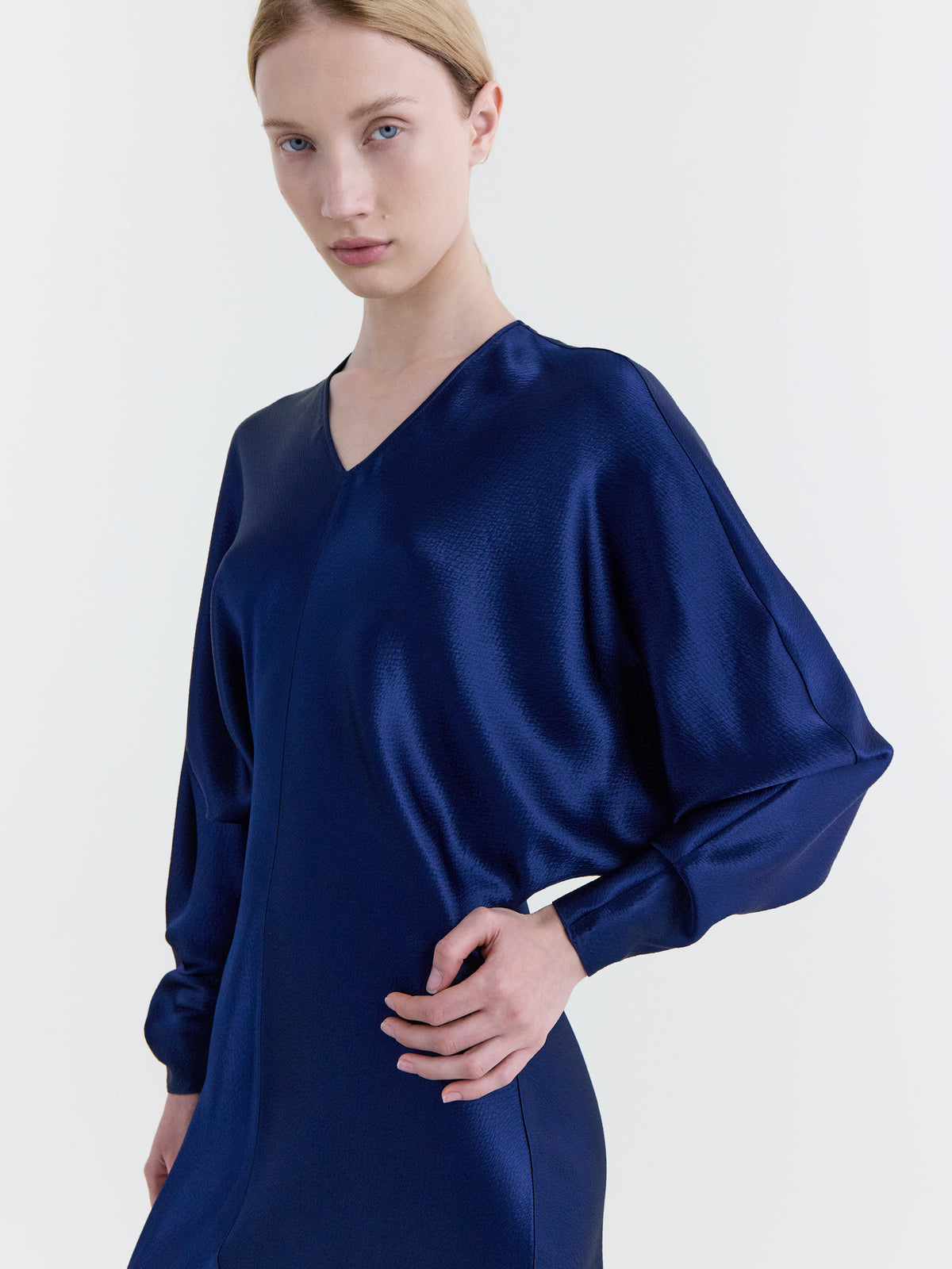 Long sleeve bias-cut dress with flared skirt in Prussian Blue hammered satin.