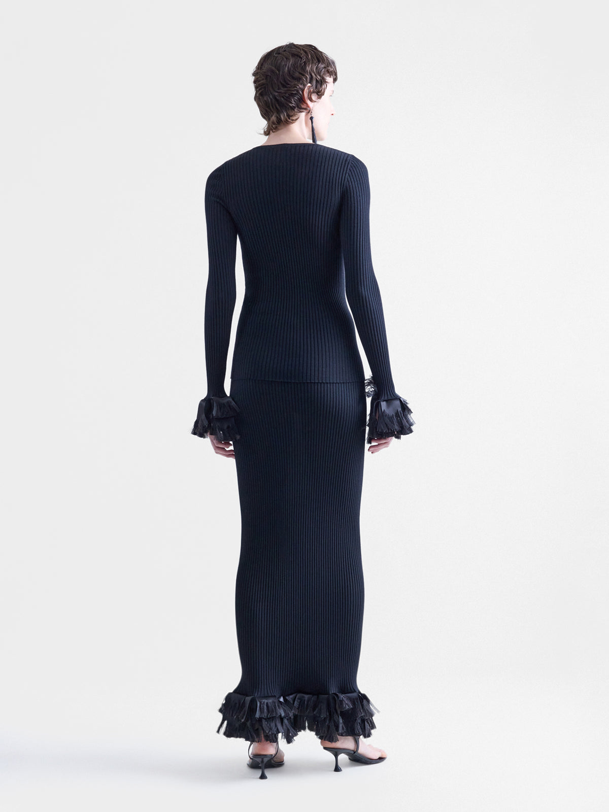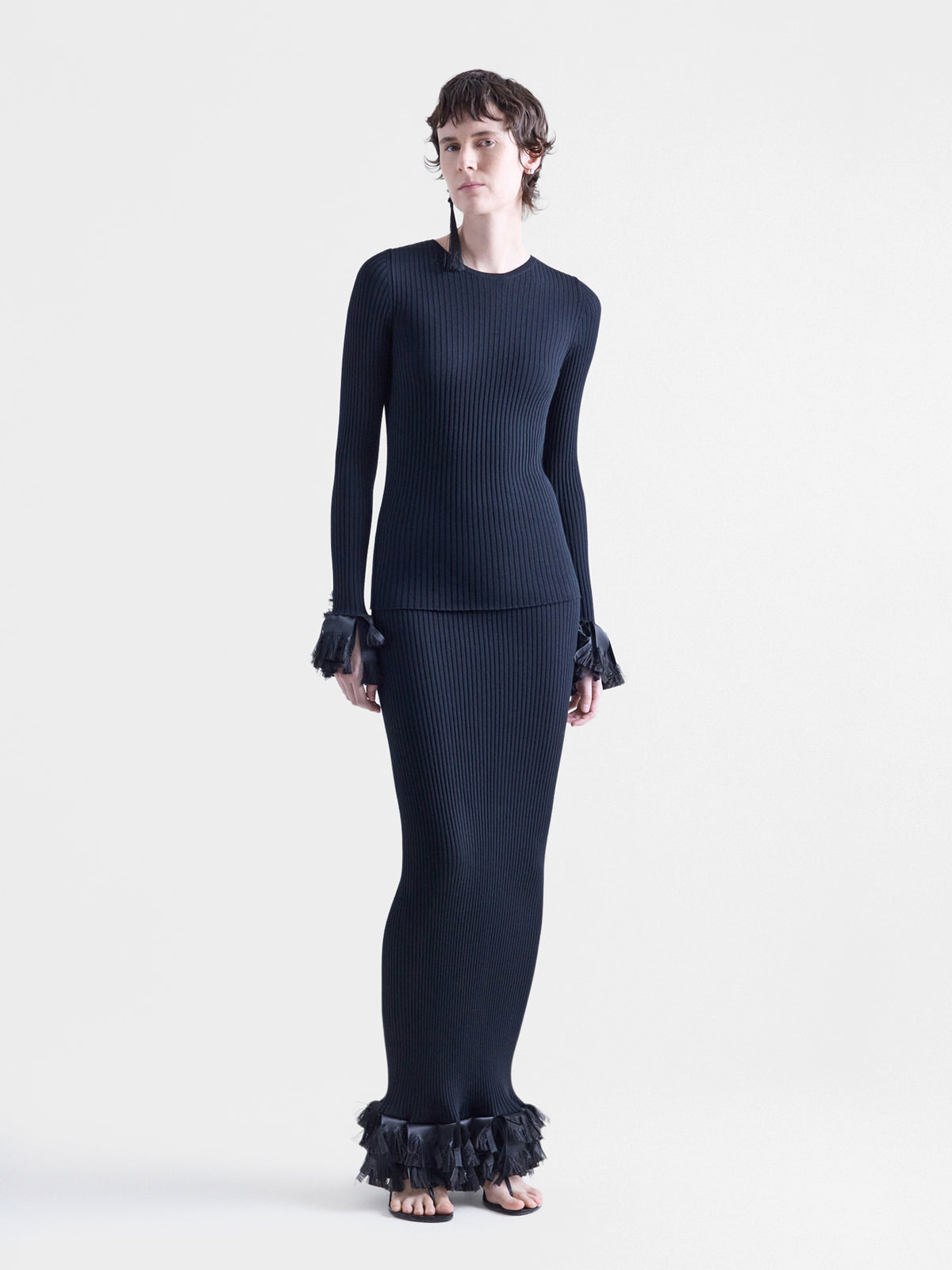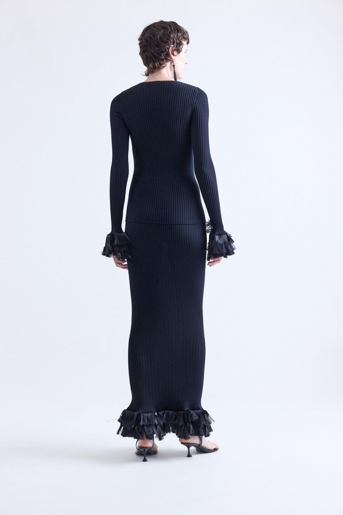 Long sleeve crewneck sweater in black superfine merino wool with hand frayed ribbon trim.