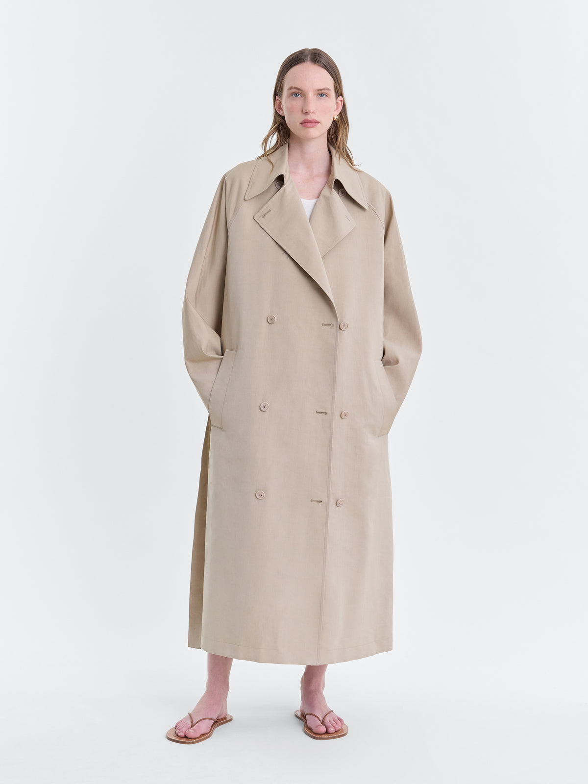 Unstructured trench coat in ecru lightweight cotton silk faille.