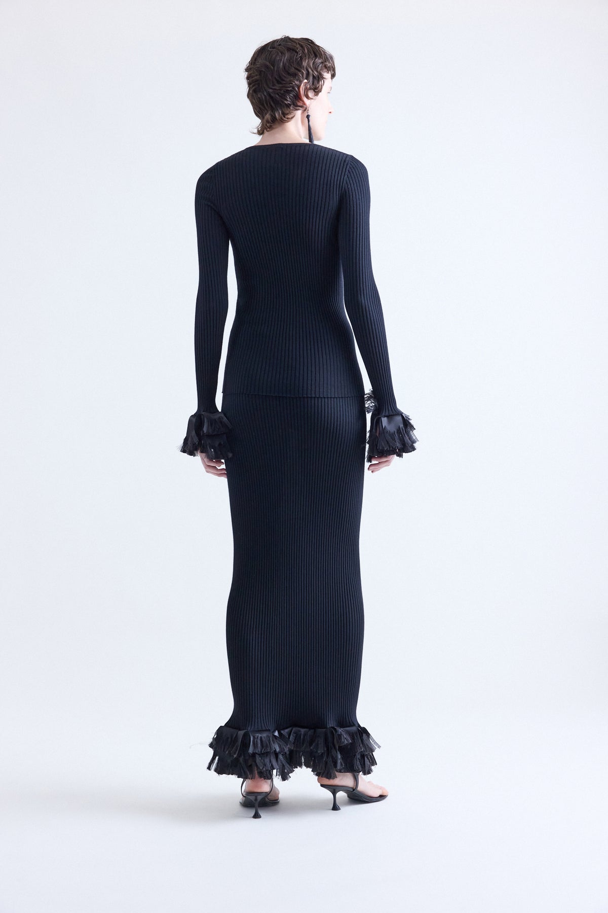 Ribbed mid length skirt with hand frayed ribbon trim in black superfine merino wool