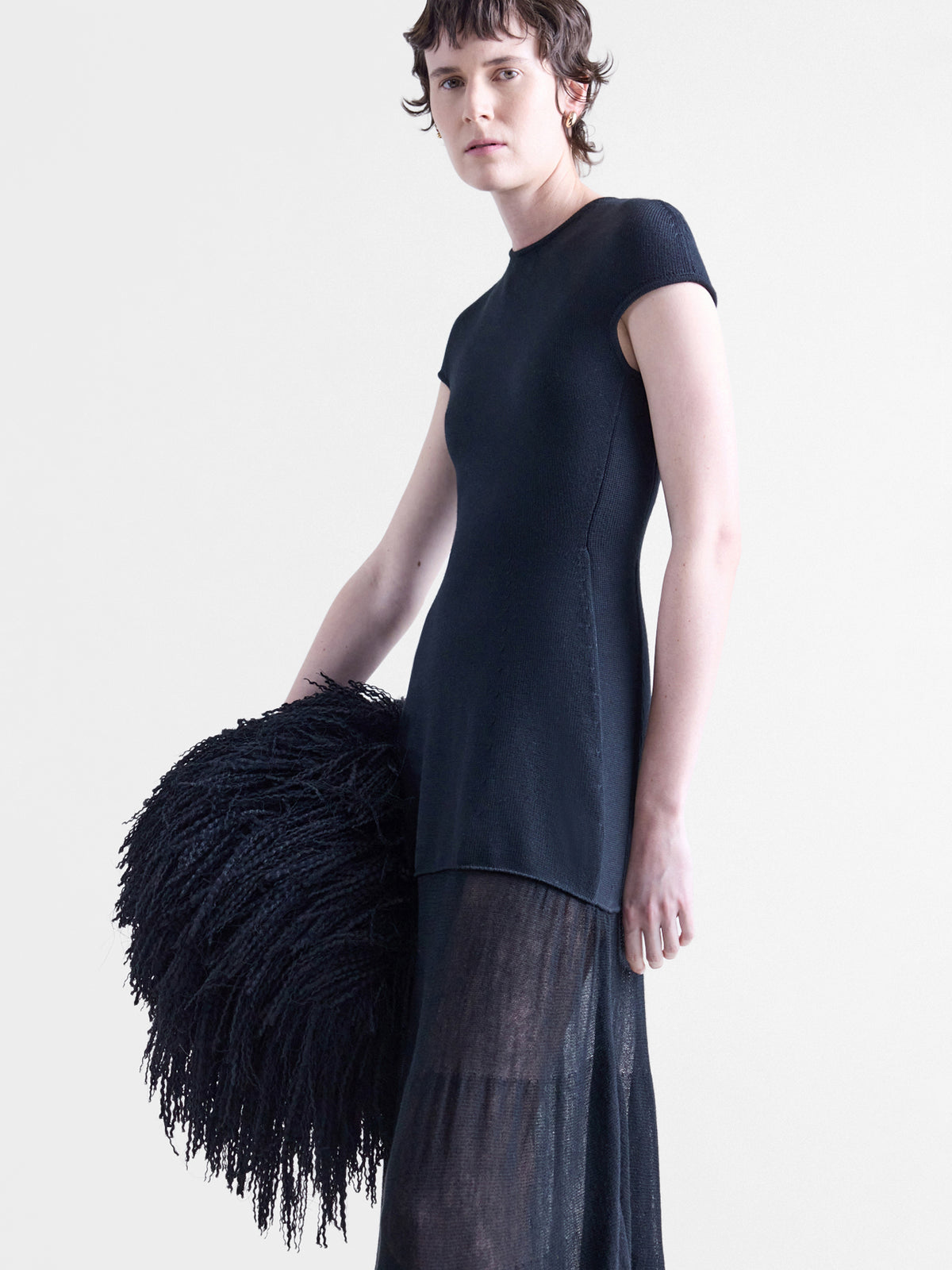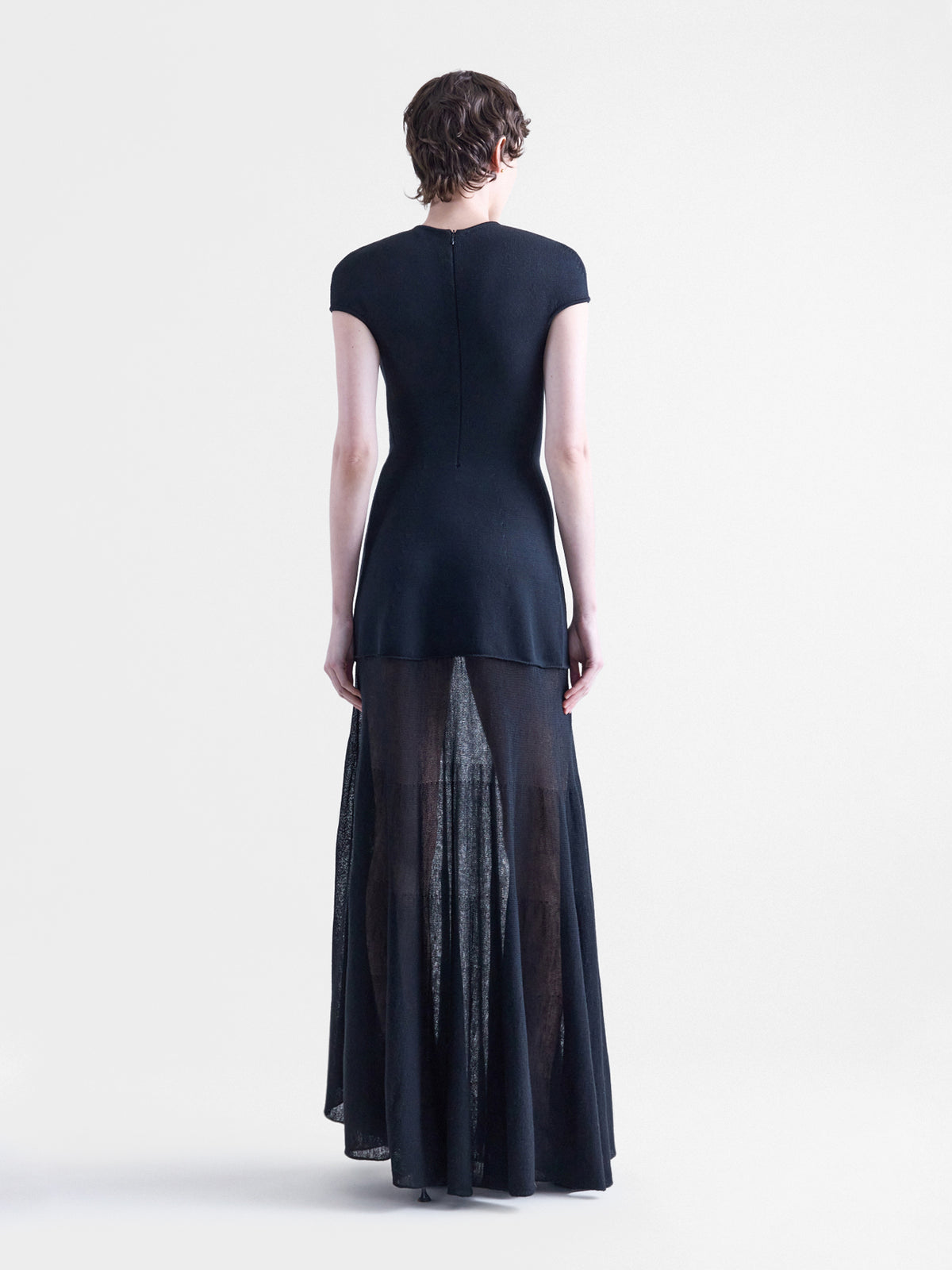 Short sleeve crewneck knit dress with sheer skirt detailing in black compact viscose cotton blend.