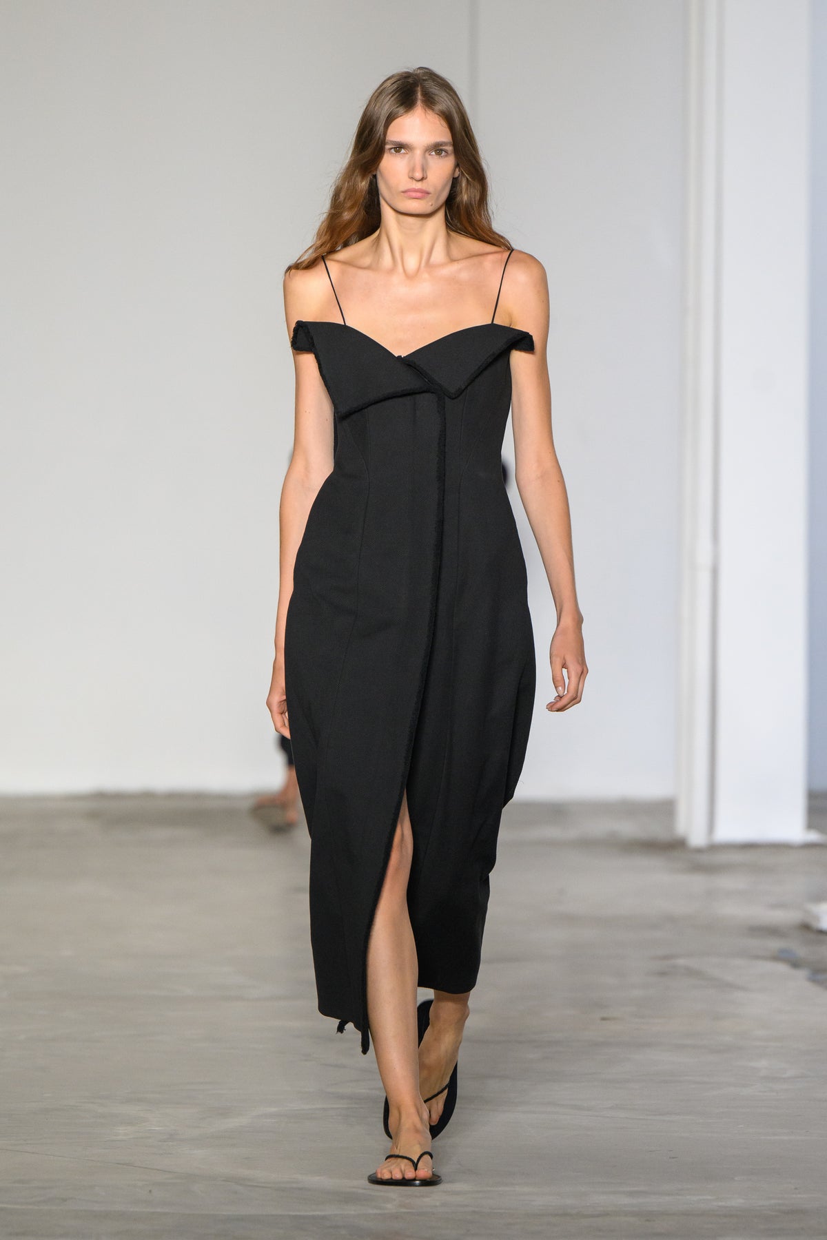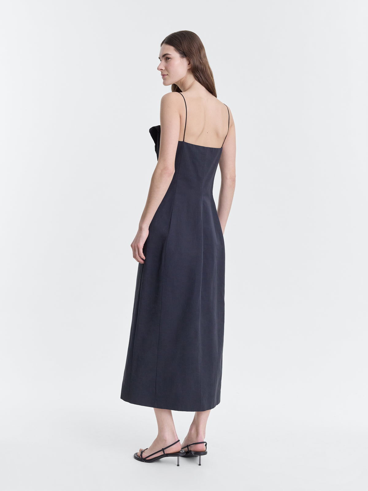 Tailored dress with folded neckline in black lightweight cotton silk faille.