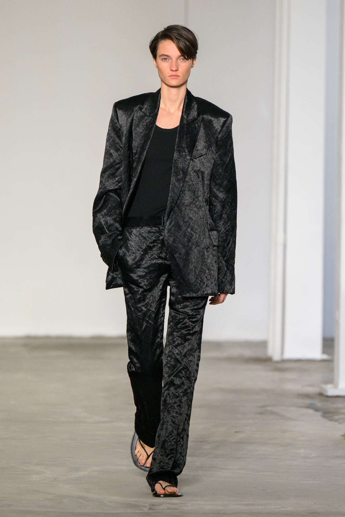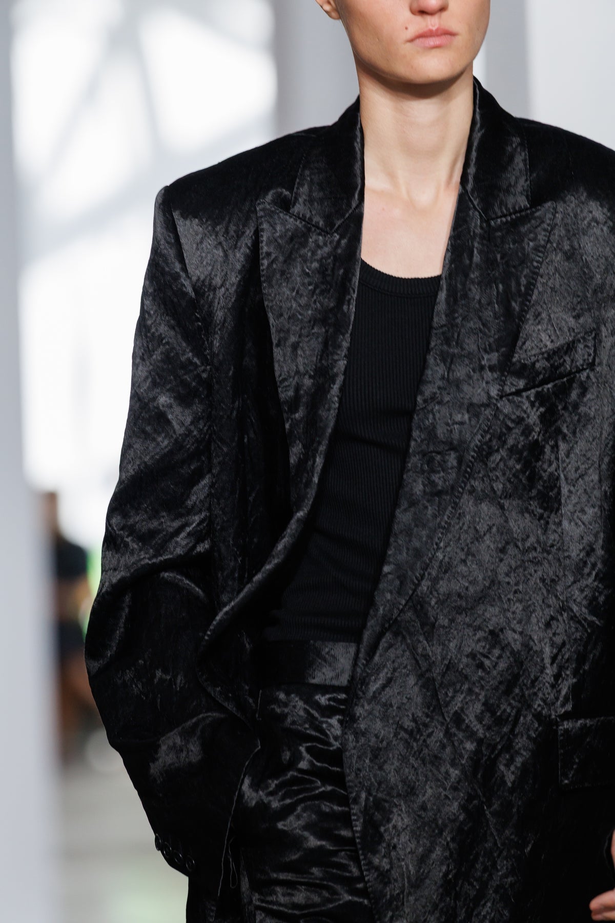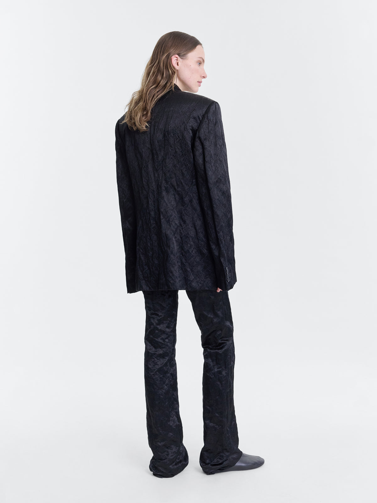 Hand crafted double breasted blazer in black coated metallic cotton.