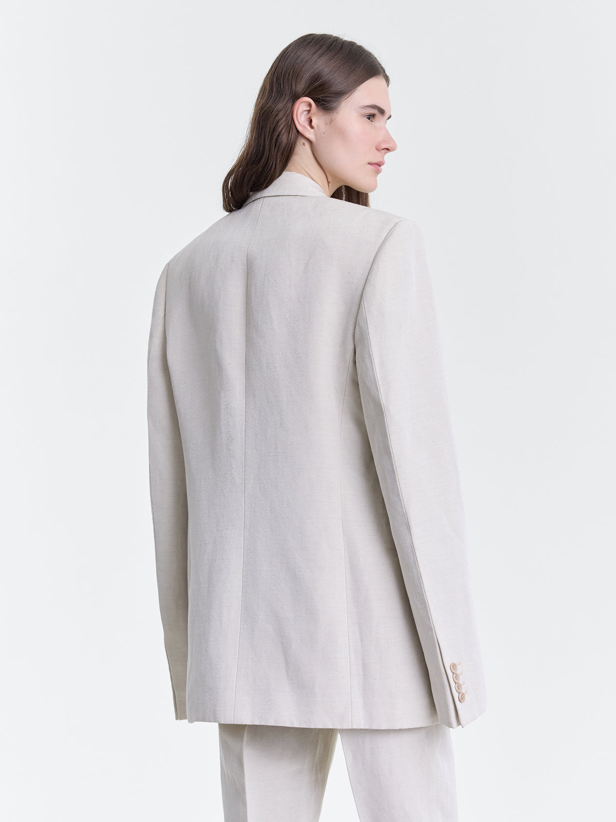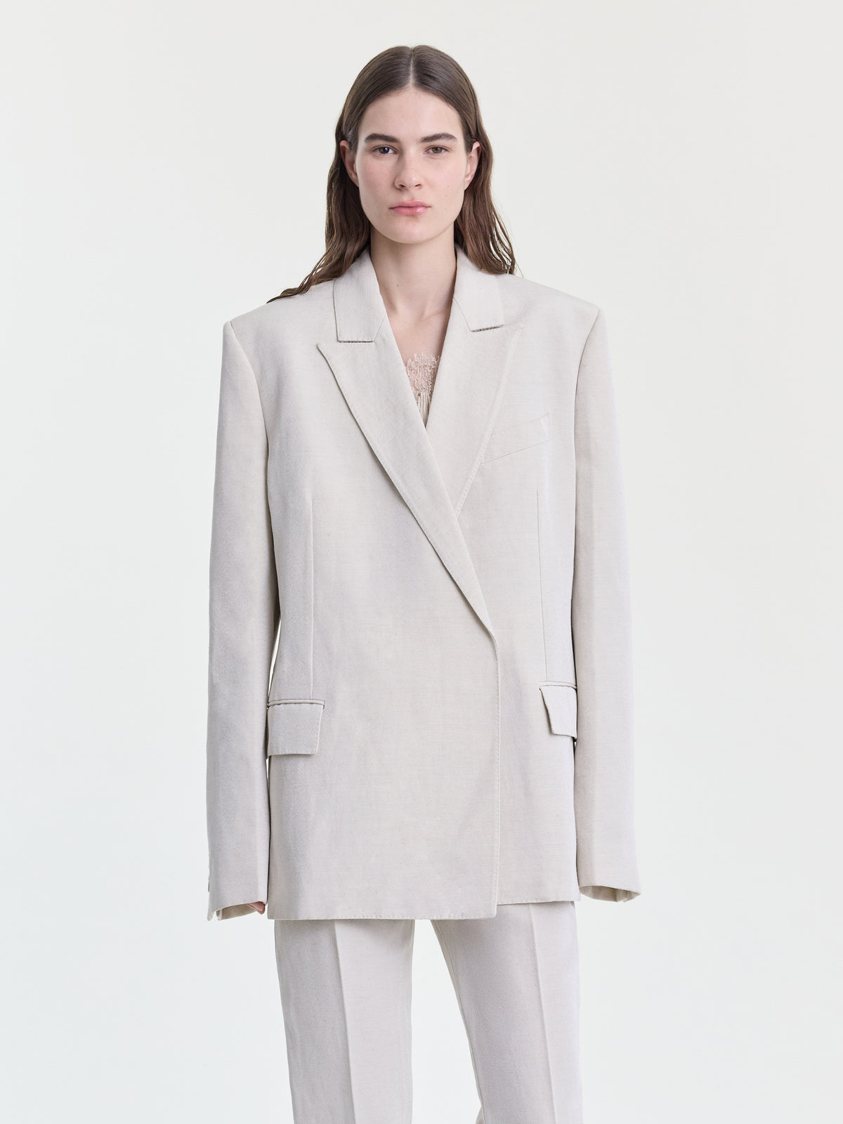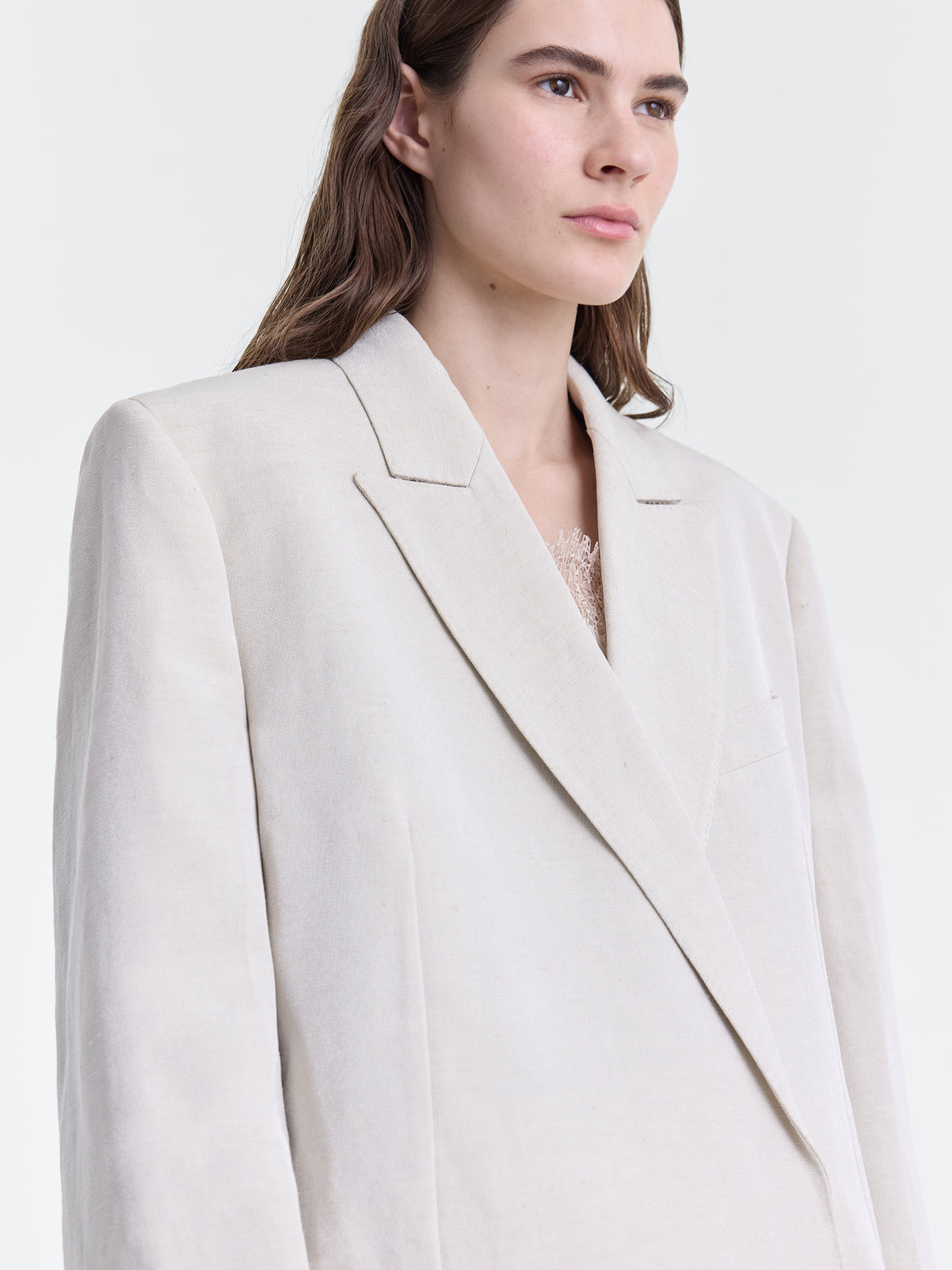 Hand crafted double breasted blazer in bone linen blend tailoring.