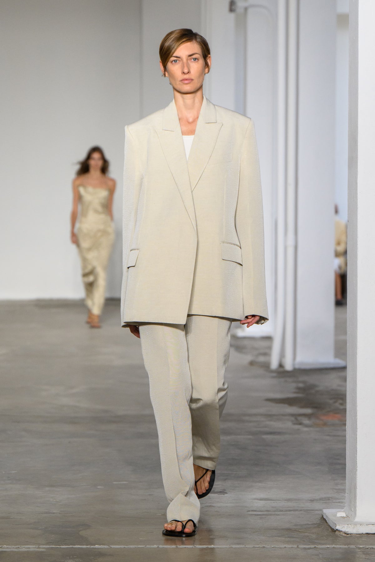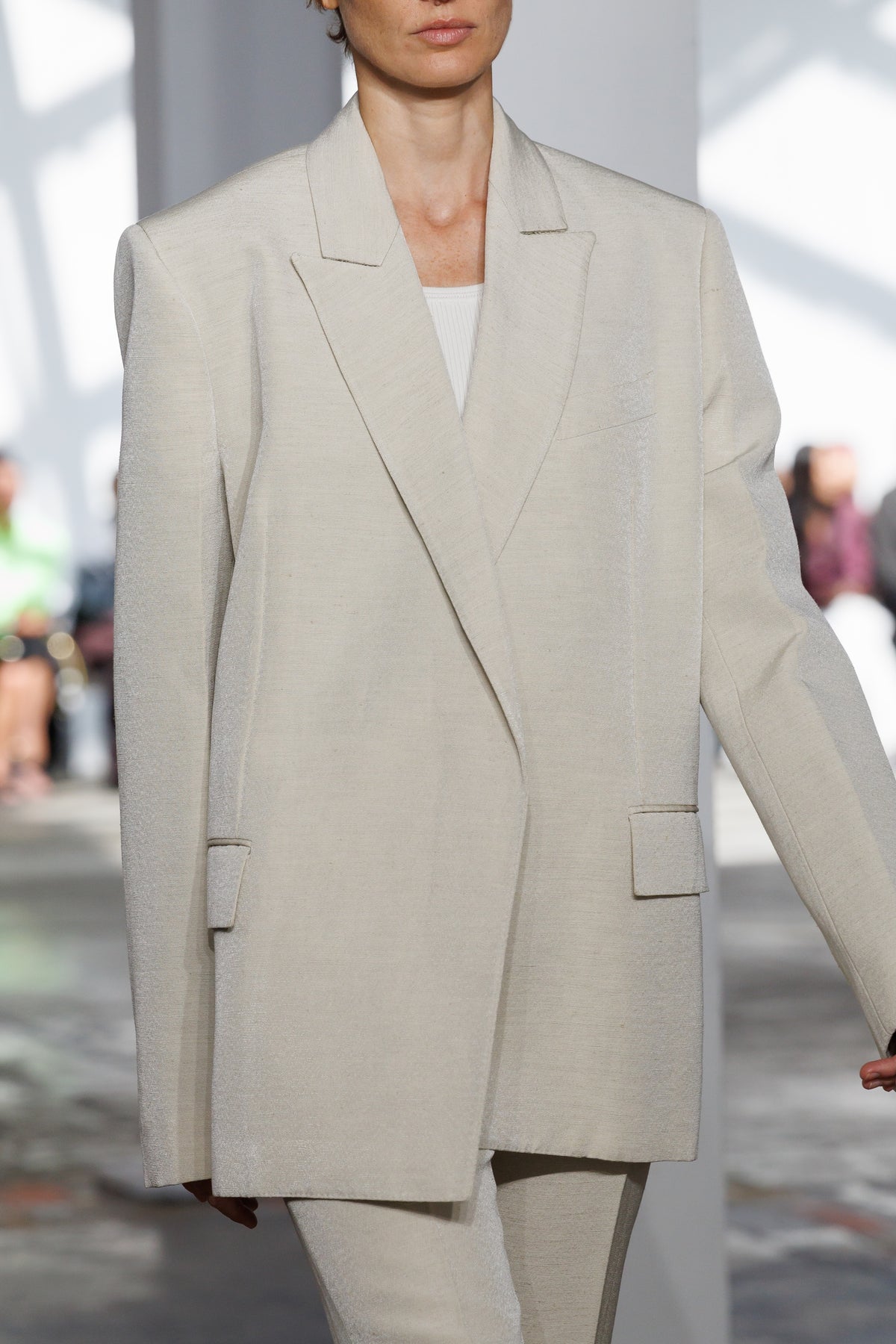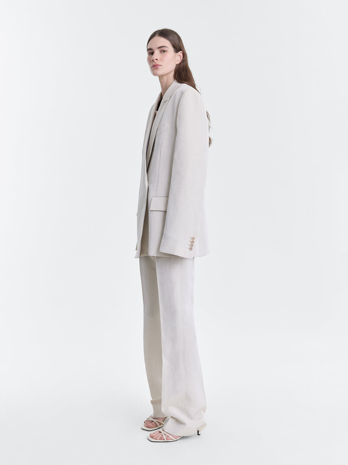Hand crafted double breasted blazer in bone linen blend tailoring.