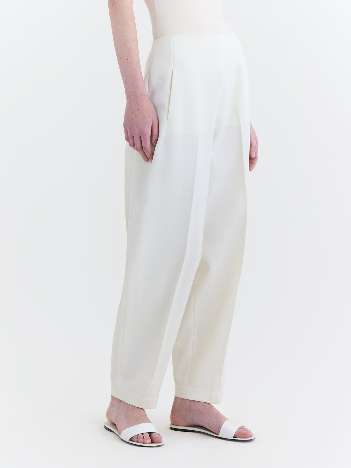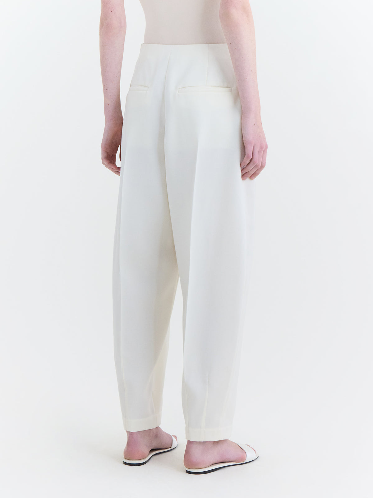 Tapered trouser with curved leg detailing in off-white wool tailoring.